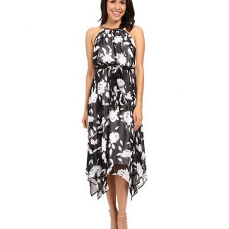 Sangria Floral Print Chiffon Midi Dress w/ Hardware
